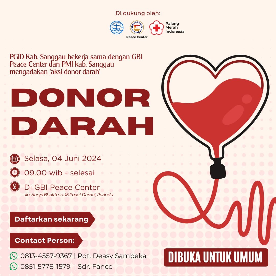 Pusat Damai, 21 Mei 2024. PGID (Persekutuan Gereja Indonesia Daerah) Kabupaten Sanggau bekerja sama dengan GBI Peace Center/Pusat Damai dan PMI Kabupaten Sanggau akan mengadakan aksi donor darah pada hari Selasa, 4 Juni 2024. Kegiatan ini akan berlangsung mulai pukul 09.00 WIB hingga selesai di GBI Peace Center yang beralamat di Jln. Karya Bhakti No. 15, Pusat Damai, Parindu. Acara ini dibuka untuk umum dan seluruh masyarakat silahkan berpartisipasi dalam kegiatan sosial yang sangat bermanfaat ini.