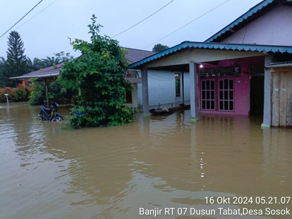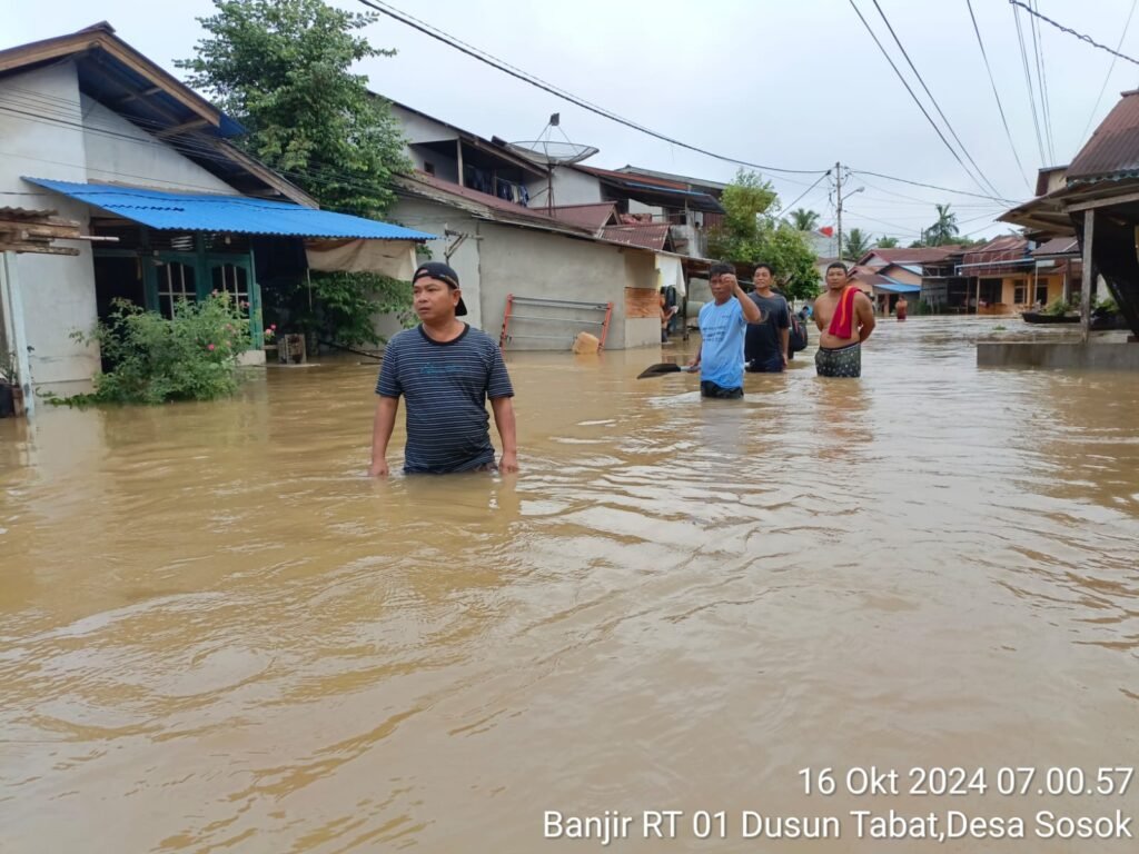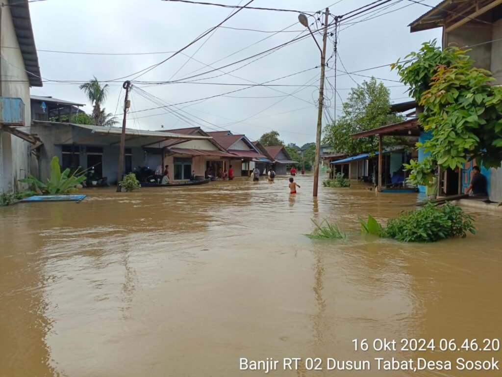 Sanggauinformasi.com. Tayan Hulu, Rabu 16 Oktober 2024. Desa Sosok, yang terletak di Kecamatan Tayan Hulu, Kabupaten Sanggau, dilanda bencana banjir besar yang mengakibatkan ratusan rumah warga terendam air. Banjir ini menyebabkan beberapa dusun di wilayah Desa Sosok, yaitu Dusun Tabat, Dusun Barage, Dusun Sosok II, Dusun Sosok I, Dusun Perayan Dangku, Dusun Tahan, dan Dusun Moling terendam banjir.