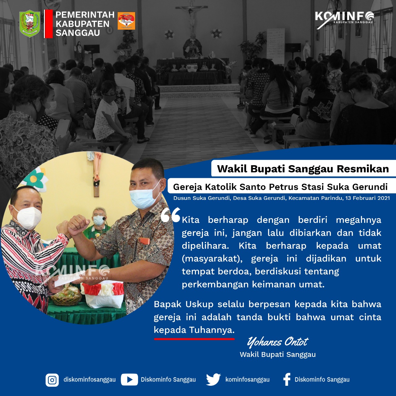SANGGAU – Wakil Bupati Sanggau, Drs. Yohanes Ontot, M.Si meresmikan Gereja Katolik Santo Petrus Stasi Suka Gerundi Paroki Pusat Damai, Keuskupan Sanggau. Bertempat di Dusun Suka Gerundi, Desa Suka Gerundi Kecamatan Parindu, Sabtu (13/2/2021). Hadir dalam kesempatan tersebut Ketua DPRD Kabupaten Sanggau, Jumadi, S.Sos, Pastor Paroki Pusat Damai, Pastor Fritz, Kepala OPD Kabupaten Sanggau, Camat Parindu, Darmikus Heri, S.Sos, Tokoh Masyarakat, Tokoh Adat dan Tokoh Agama, serta seluruh umat stasi Suka Gerundi Paroki Pusat Damai.