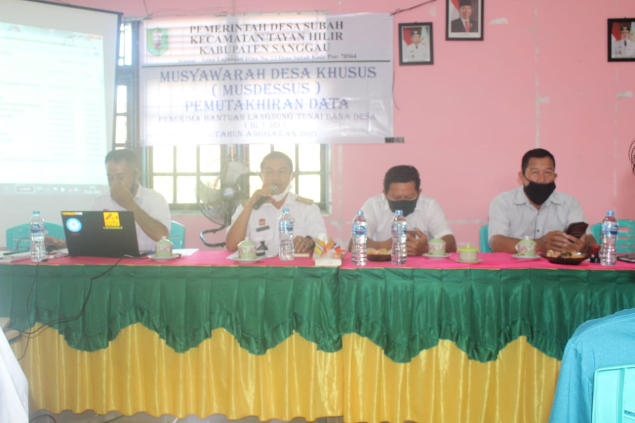 Subah, Pemerintah Desa Subah mengadakan musyawarah desa khusus (Mudesus) tentang Bantuan Lansung Tunai Dana Desa (BLT DD) pada hari Rabu 20 Januari 2021 di ruang musyawarah kantor desa Subah.