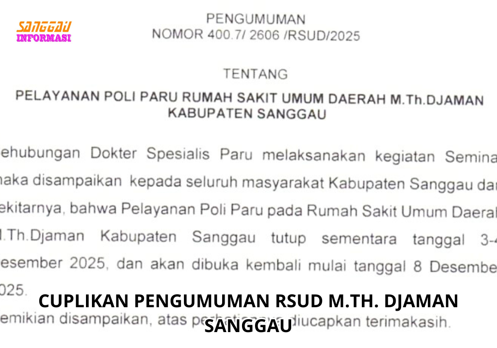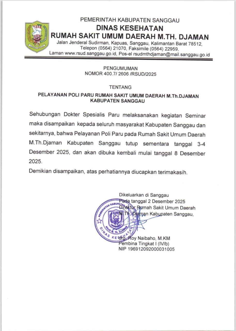 Pemerintah Kabupaten Sanggau melalui Dinas Kesehatan dan Rumah Sakit Umum Daerah (RSUD) M.Th. Djaman menyampaikan informasi penting terkait operasional pelayanan kesehatan, khususnya Pelayanan Poli Paru.