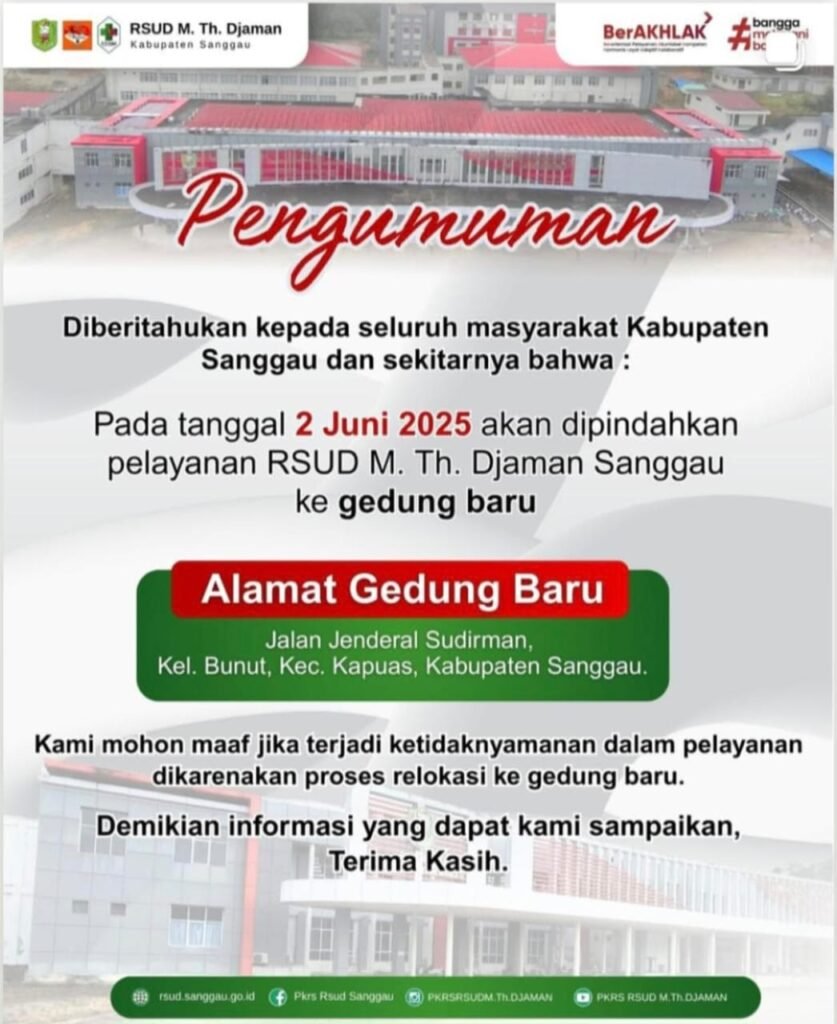 SANGGAU – Masyarakat Kabupaten Sanggau dan sekitarnya diimbau untuk memperhatikan informasi penting terkait pelayanan kesehatan di RSUD M. Th. Djaman. Mulai tanggal 2 Juni 2025, seluruh layanan rumah sakit akan dipindahkan ke gedung baru yang berlokasi di: