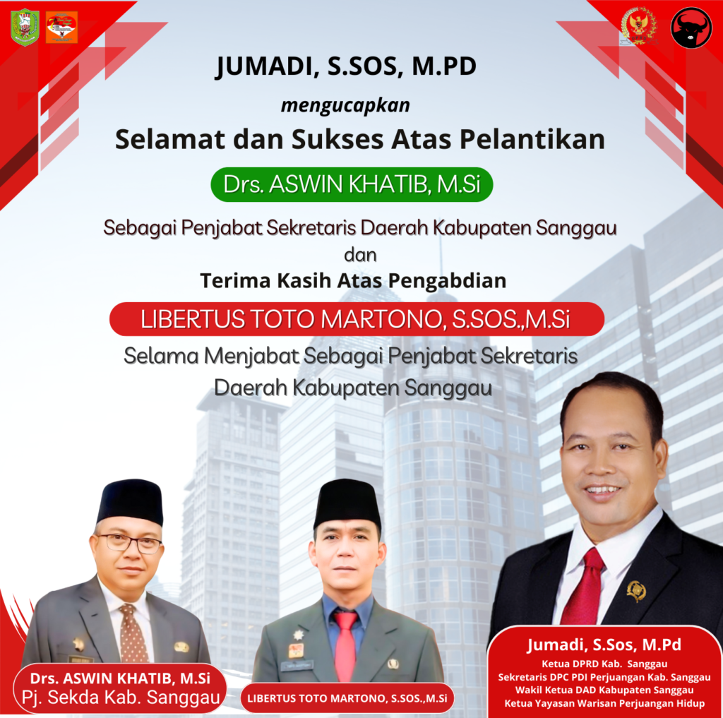 Penjabat (Pj) Bupati Sanggau, Suherman, melantik Aswin Khatib sebagai Pj Sekretaris Daerah (Sekda) Kabupaten Sanggau pada Senin, 9 September 2024, di aula lantai satu Kantor Bupati Sanggau. Acara ini dihadiri oleh Forkompinda Kabupaten Sanggau, para Kepala Perangkat Daerah, Pejabat Pimpinan Tinggi Pratama Kabupaten Sanggau, para Camat se-Kabupaten Sanggau, Ketua Tim Penggerak PKK, Ketua Dharma Wanita, serta rohaniwan.