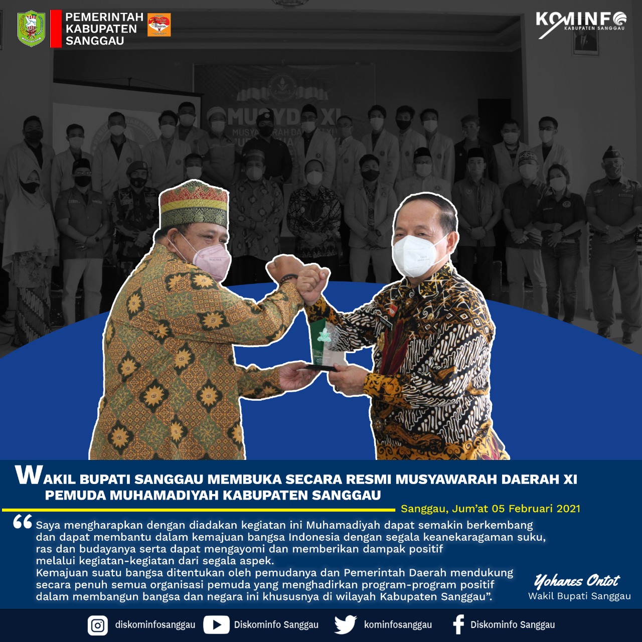 Musda ini mengusung tema “Revitalisasi Gerakan Pemuda Muhamadiyah Untuk Sanggau Yang Berkemajuan” Tahun 2021. Kegiatan Musda ini dilaksanakan dengan menerapkan protokol kesehatan. Hadir saat itu, Wakil Bupati Sanggau Drs. Yohanes Ontot, M.Si, Pasi Inteldim 1204/Sgu Kapten Inf. Saiful Husna, Sekretaris Pemuda Muhamadiyah Kalbar Aji Kurniawan, Ketua PD Muhamadiyah Kabupaten Sanggau Ade Djuandi, S.Pd.I, Pimpinan Daerah Pemuda Muhamadiyah Sanggau Indra Jamaludin, Kasat Korcab Banser Sanggau Hamka Sukarti, Ketua PFKPM Kabupaten Sanggau, Nur Kurniawan, A.Md, Ketua Pemuda Dayak Kabupaten Sanggau (PDKS) Yuvenalis Krismono, Ketua DPC Pemuda Pancasila Sanggau Suherman, Paguyuban Guyub Gawe Guno Kecamatan Kapuas Wasdi, BEM PSDKU Polnep Sanggau Egi Pujianto.